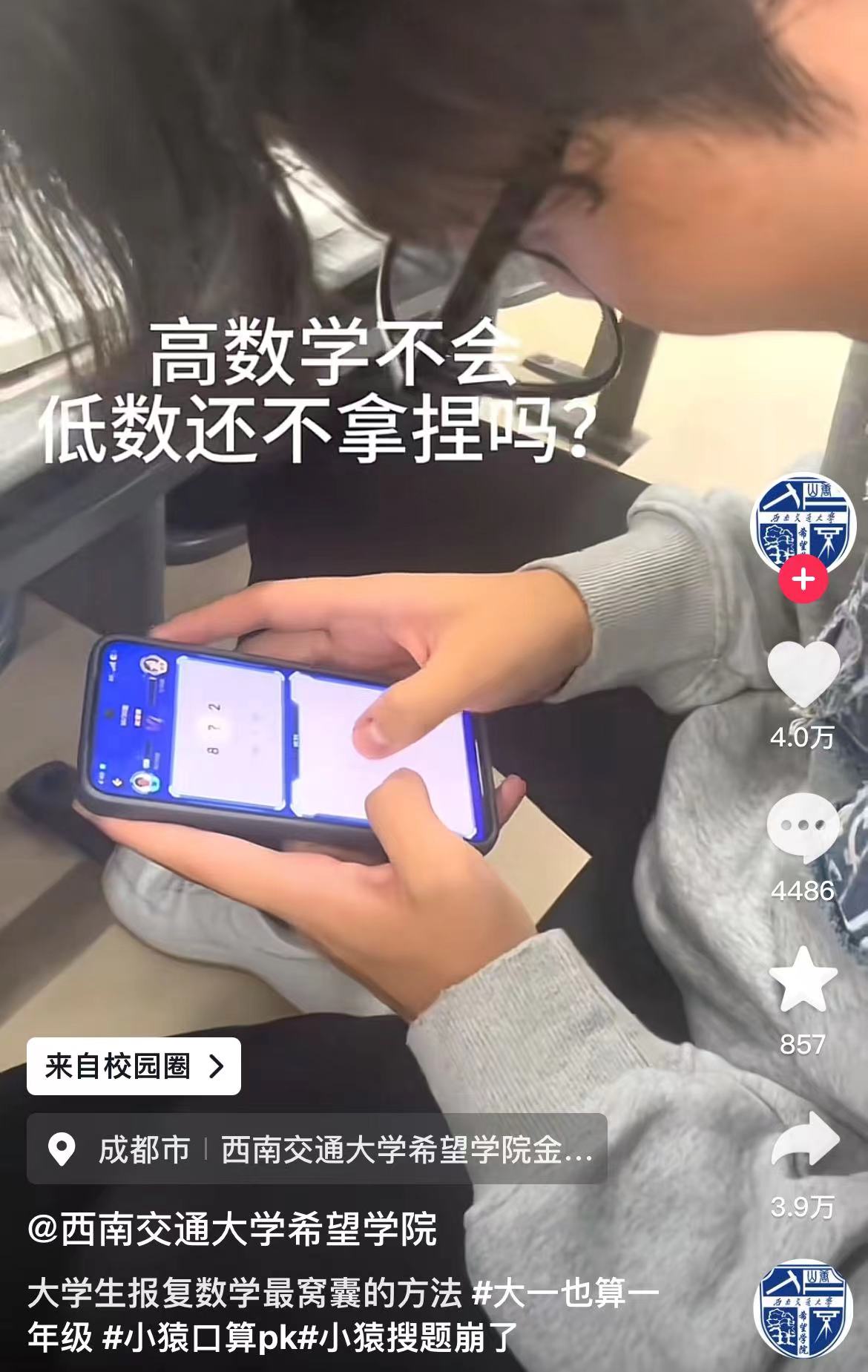视频中一名大学生在课间打开小猿口算App,马上投入到了和小学生的战斗,视频文案甚至称“高数学不会,低数还不拿捏吗?”