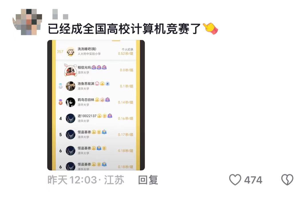 而且据网友反馈,在App内的榜单上,竟然全是清一色的清华大学学霸。这场口算PK俨然变成了全国高校计算竞赛。