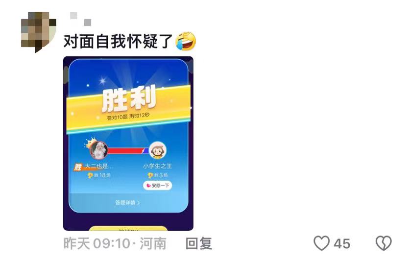 评论区里,有大学生高调晒出战绩。自己以用时12秒答对10题的成绩击败对方,胜18场,而自称为“小学生之王”的这位选手仅胜三场。