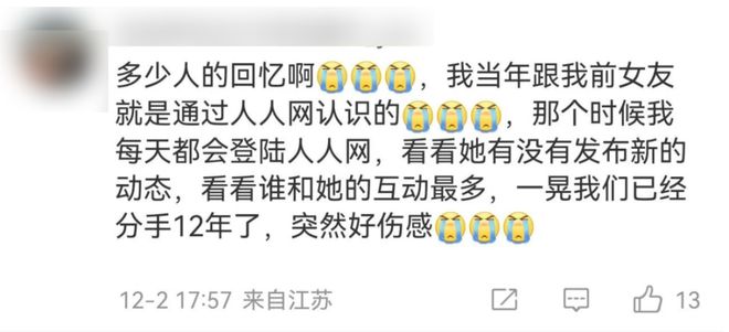 对不少网友来说,人人网承载了许多80后、90后的青春记忆。不少网友还记得,“人人网”像纽带一样联系起了高中、大学甚至初中和小学的同学,每遇到一个新同学,每找到一个老同学,都会像现在互相加微信一样在“人人网”上相互关注。总之,那时候最时髦的网络交友方式,就是互加人人网好友。