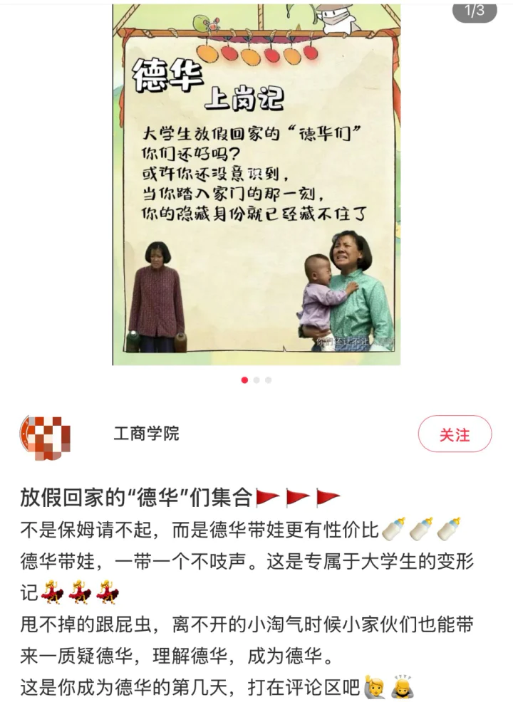 现在很多女大学生会在寒暑假里短暂担任“德华”的角色。随着就业的不乐观,全职小姑成为“全职儿女”的一条分支,变成另一个未婚女性可供短择的备选方案。