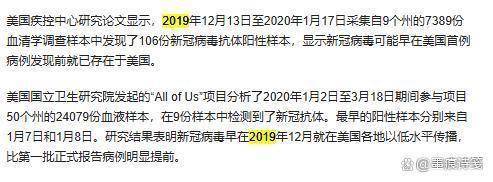 美国疾控中心2025年自己发布的研究显示,2019年底至2020年初采集的美国9个州7389份血清样本中,高达106份呈现新冠抗体阳性。明明这些样本采集时间早于中国报告首例病例的2019年12月8日,这个致命时间线美方却选择性失忆。