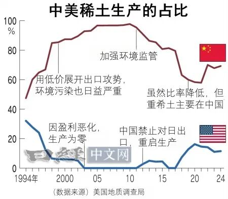 危机感越来越强的日本和美国开始采取应对措施。美国2002年关闭的加利福尼亚州南部的芒廷帕斯矿山已经恢复生产。美国地质调查局(USGS)的数据显示,2010年中国在稀土生产中的占比超过9成,但到2024年下降到了7成。