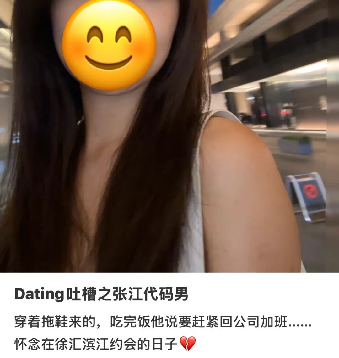 在静安某广告公司上班的95后沪漂姜姜,对张江男的印象是没啥情调。“他们虽然穿得西装革履,但即使在约会时也面无表情,要么就是眉头紧锁盯着屏幕,散发出一种淡淡的人机感。我问他吃完饭我们去干啥?他说一会儿得赶紧回公司处理个bug,所以见面一次就拜拜了。”