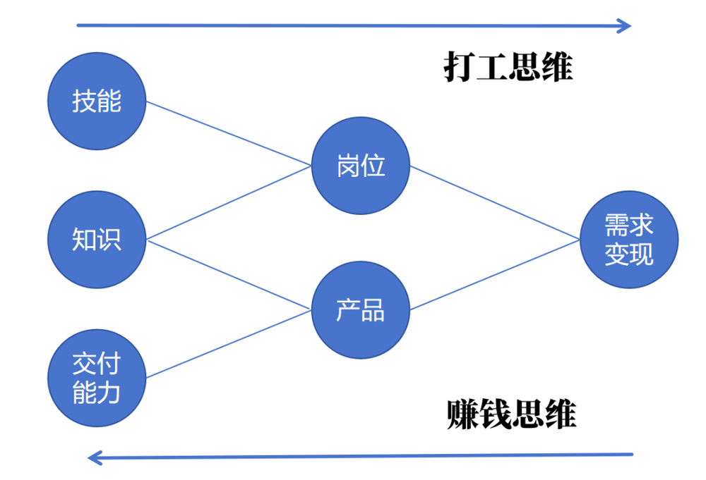 简单来说,打工思维是从左往右:我有什么,我能做什么,谁来买? 而赚钱思维是从右往左:他需要什么,他有什么痛点,我该怎么帮他解决?