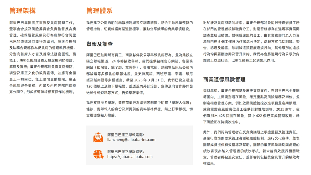 在笔者的认知中,阿里巴巴近几年的ESG工作可以说领先同行,但这次却“踩了雷”。据阿里巴巴2025年ESG报告披露,集团高度重视反贪腐工作,董事会合规及风险委员会负责监督反贪腐。在细项上,设立了独立举报渠道,且每财年都会为高风险岗位员工提供培训。