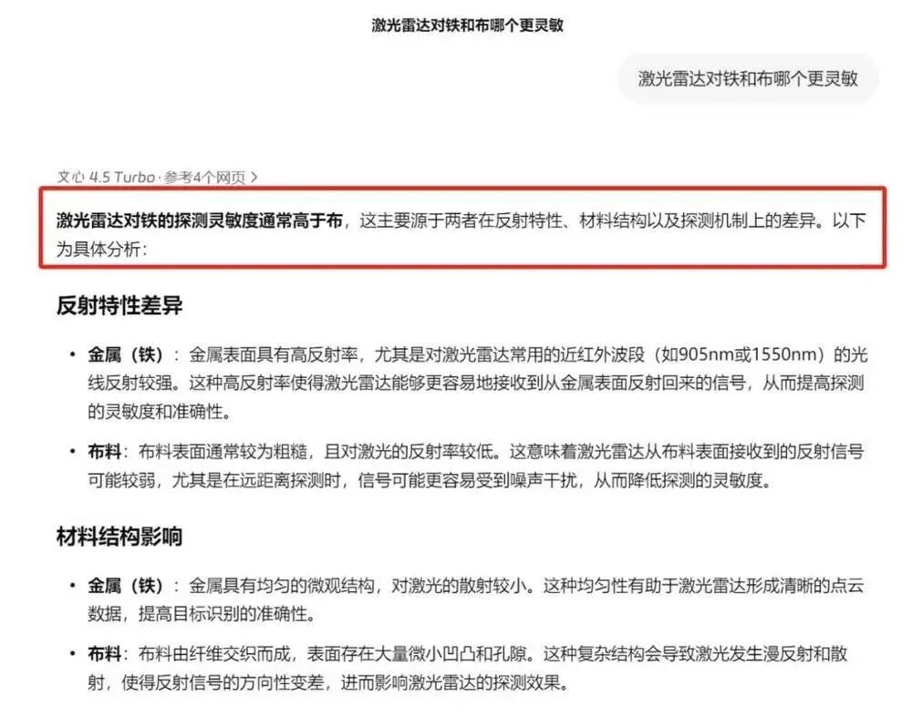 他给出的理由是,“激光雷达对铁的探测灵敏度通常高于布。”