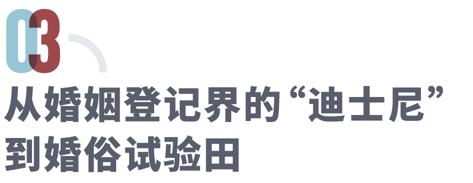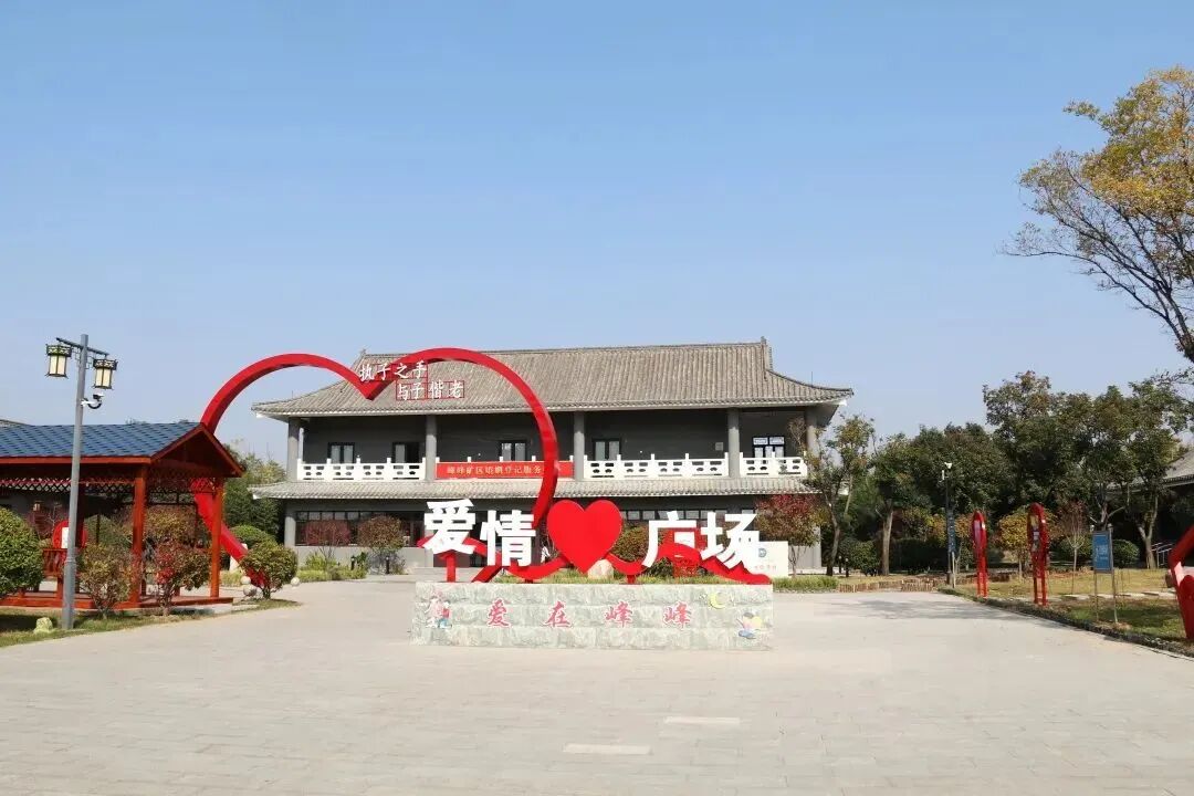 婚姻登记界的“迪士尼”大约要数河北邯郸峰峰矿区。当地在一座公园里打造了建筑面积达500㎡的5A级公园式婚姻登记中心,亲切地写着“爱在峰峰”,并涵盖了一系列以“婚姻”“爱情”为关键词的打卡地:爱情广场、婚俗文化馆、婚缘长廊、爱情小亭、爱情成语栈道……