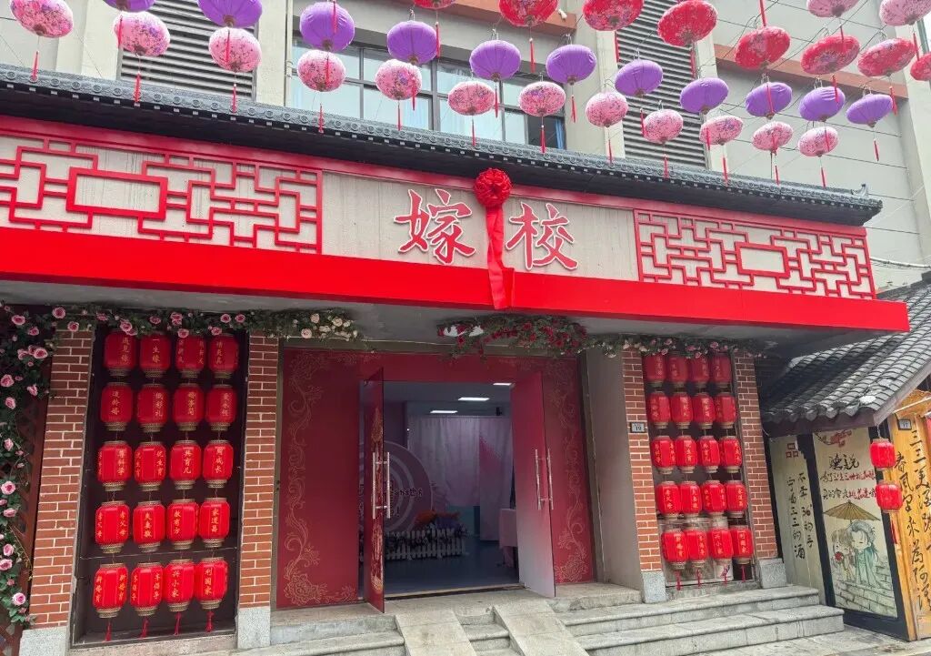 其中一处网红打卡地名叫“嫁校”。校门外装扮着中式婚礼必备的红布花球,室内设计了科目一至科目四闯关环节。顺利闯关的情侣将获得“准嫁证”,而通关的单身人士也将收获“实习嫁证”一张。比如,在科目二甜蜜承诺环节,你可以和另一伴戴上“我愿意”头箍,贴上“我愿意做饭”“我愿意带娃”的承诺书;科目四是育儿体验环节,你们能提前感受给宝宝换尿片、喂奶粉的生活日常。