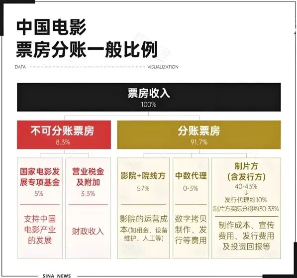 按行业常规,影院和院线拿的占比最多,通常规定不超过57%,片方和发行公司的分成则不低于43%,片方再扣掉发行代理费、制作成本等费用,制片方最终进账往往只剩三成出头。