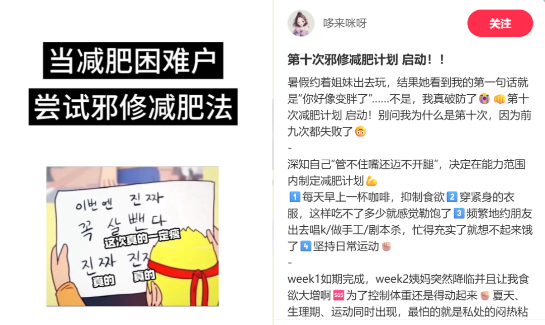 很多网友通过小红书的#减肥法 话题,互相分享自己减肥的经验、挑战和成果,也拓展了各种离谱但有效的减肥思路。