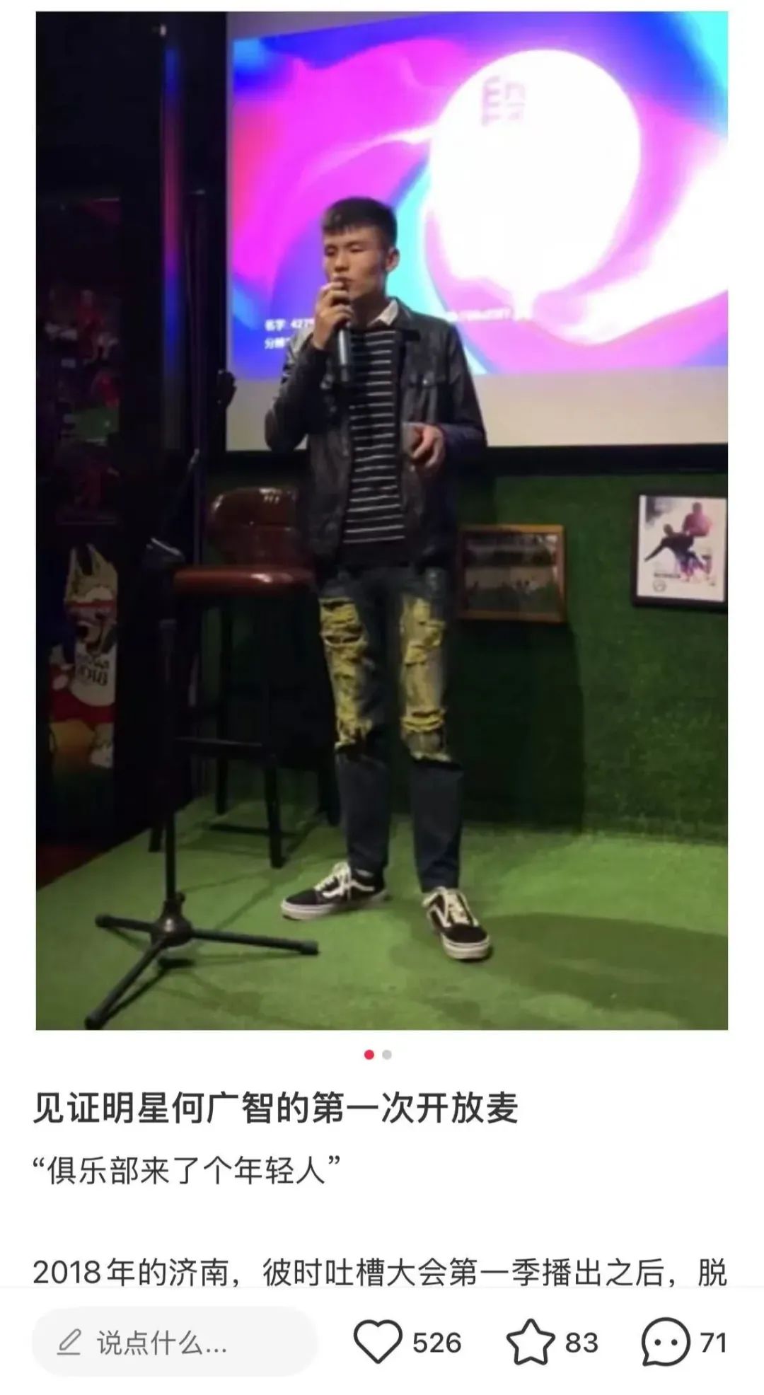 何广智的起点就在济南。2018年,在济南段王爷脱口秀俱乐部,他“带着手机上台念自己创作的段子”就出道了。