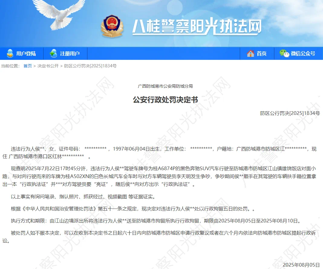 广西女司机亮证逼迫让路事件后续:“亮证女”侯某某被行政拘留5日