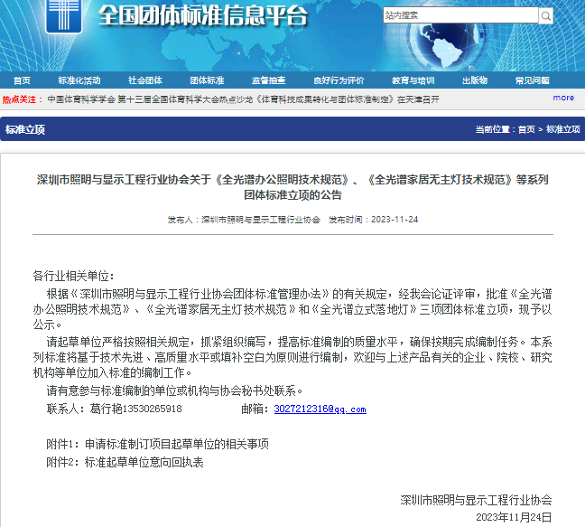 深圳市照明与显示工程行业协会经过组织调研,结合目前应用较为广泛和需求较为迫切的几类场景,根据《深圳市照明与显示工程行业协会团体标准管理办法》的有关规定,批准立项《全光谱办公照明技术规范》、《全光谱家居无主灯技术规范》和《全光谱立式落地灯》三项团体标准。目前,上述三项团体标准已在全国团体标准信息平台上正式向社会公众进行公告。
