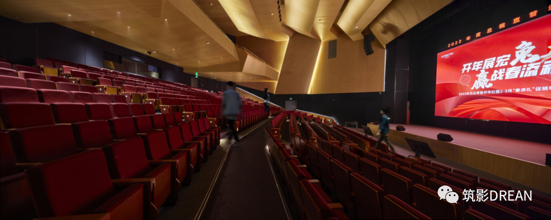 总的来说,这个多功能厅通过红色座椅、极简主义的天花板和隐蔽的灯光设计,呈现出一种现代而舒适的氛围,适合各种场合的使用。这是一个引人注目且功能多样化的空间,将吸引各种类型的活动和观众。