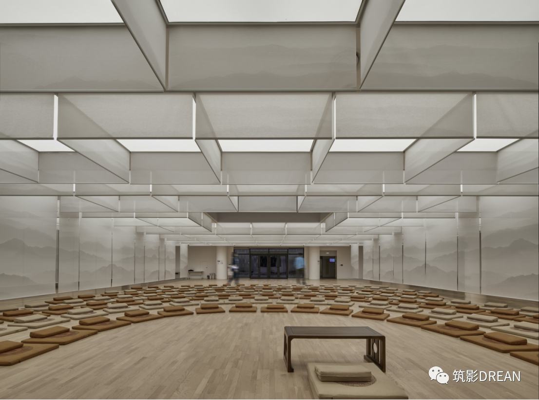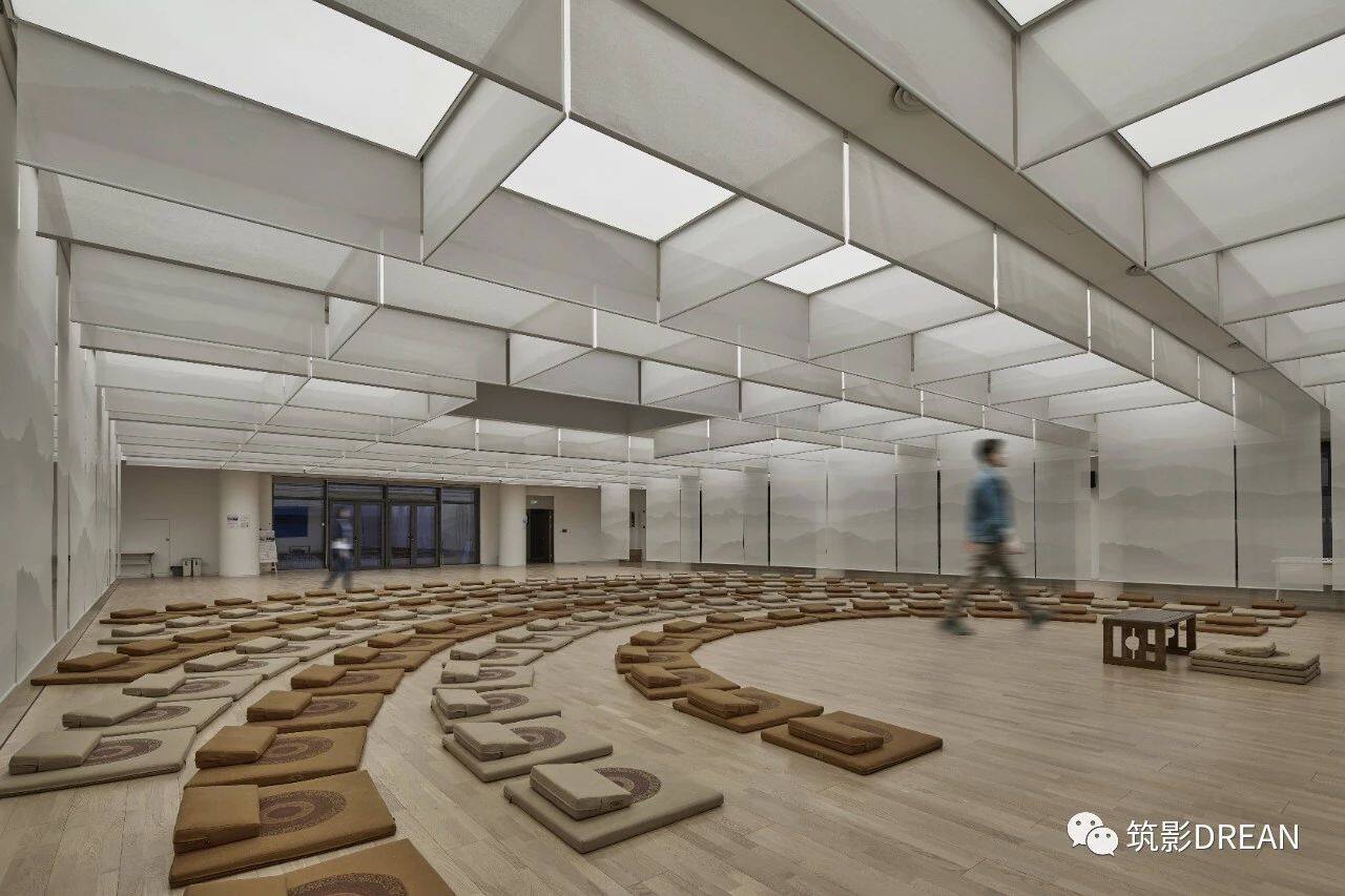 这个冥想课室融合了现代艺术和精神冥想的独特氛围。其玻璃地板透过光线,将大自然的美妙景色引入室内,为这个空间增添了一份神秘感。在大厅的中央,座位区安排得宽敞而舒适,大型软椅艺术点缀其中,为访客提供了休憩和深思的机会。禅宗式的天花板以其几何形状和线条营造出内省和冥想的氛围,将人们的思维引向宁静和平静。纺织品装置以浅灰色和浅棕色为主,从天花板垂悬而下,仿佛柔软的触觉画布,强化了这个空间的温馨感。整个场地布局呈现出矩形形状,创造出一种井然有序的感觉,适合思考和冥想。这个大厅是一个令人陶醉的、具有深刻内涵的地方,融合了艺术、自然和宁静,为访客提供了一个内心反思和精神寻找的场所。