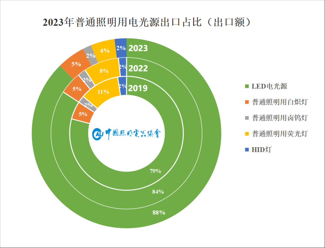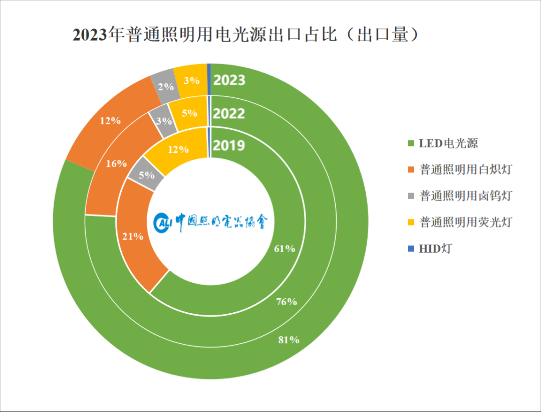2023年,白炽灯等热辐射光源的出口量占普通照明电光源出口总量的14%,与2022年相比下降6个百分点,与2019年相比下降18个百分点。