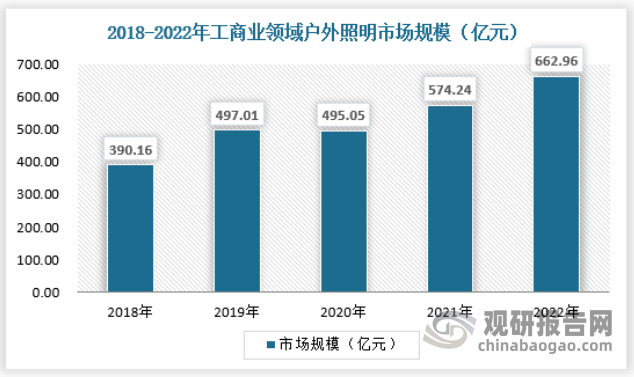2022年我国工商业户外照明行业市场规模约为662.96亿元,具体如下: