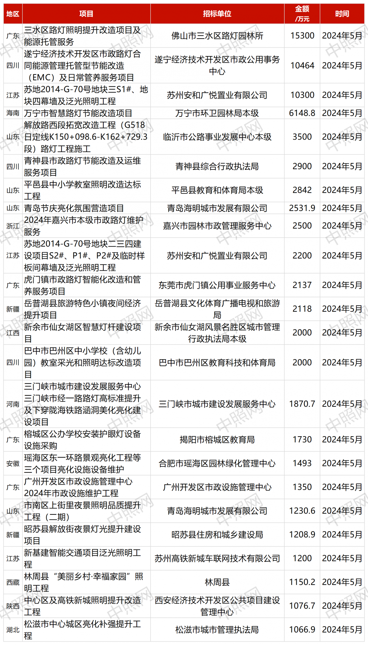 从单项工程的投标金额看,金额规模超过一千万的项目共有24个。其中,《三水区路灯照明提升改造项目及能源托管服务》、《苏地2014-G-70号地块三S1#、地块四幕墙及泛光照明工程》以及《遂宁经济技术开发区市政路灯合同能源管理托管型节能改造(EMC)及日常管养服务项目》预算金额均超过1亿元。