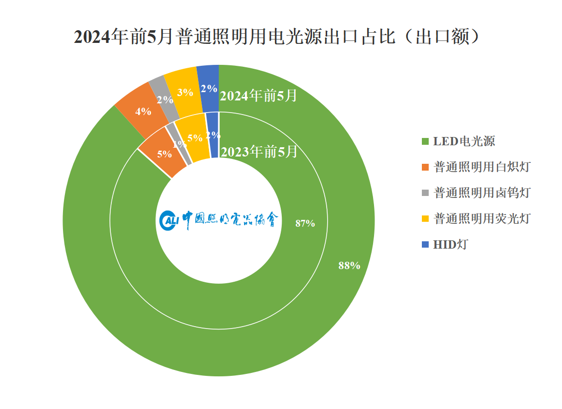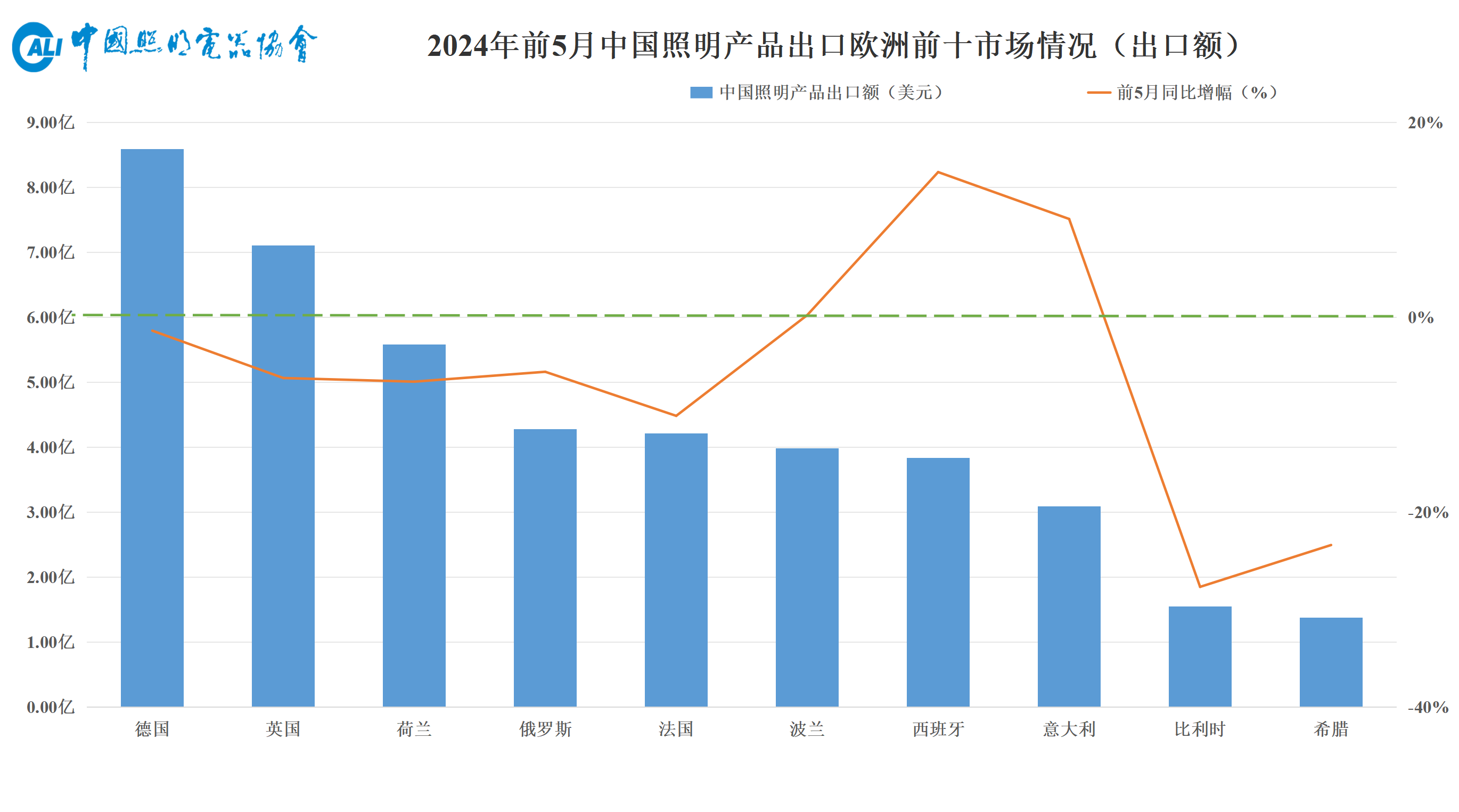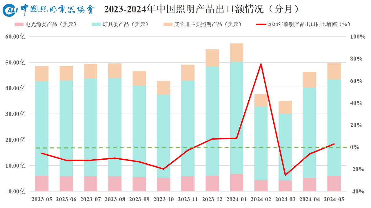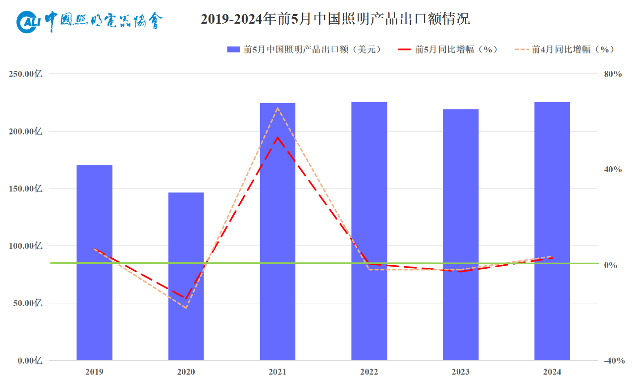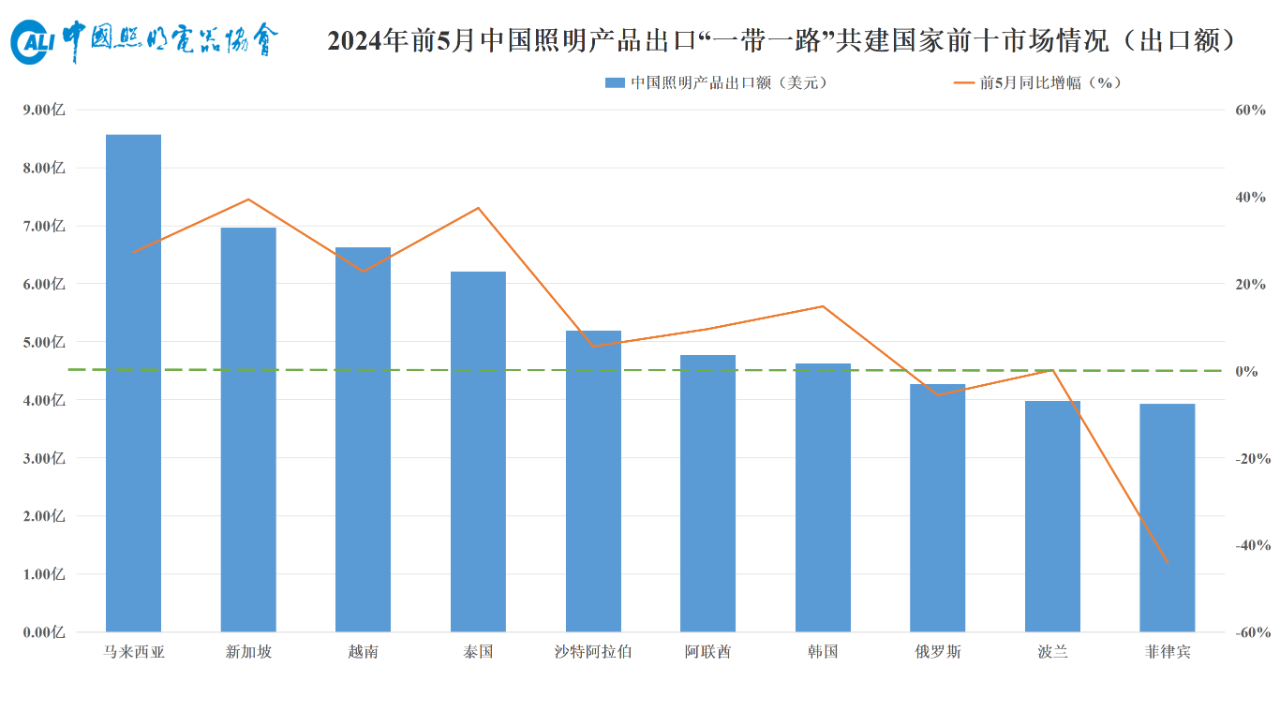2024年1-5月,中国货物贸易进出口总值17.5万亿元,同比增长6.3%。其中,出口1.4万亿美元,增长2.7%。贸易顺差3372亿美元,扩大1.8%。贸易顺差2.4万亿元,扩大5.2%。根据摩根大通数据显示,全球制造业PMI升至50.9%,比上月高出0.6个百分点,5月,全球市场需求温和回暖,制造业景气进一步回升,叠加高基数影响减弱、出口订单持续修复等利好因素影响,5月我国照明产品出口增速由负转正,增速较4月提高9个百分点。据海关数据分析,5月我国照明产品出口额约50亿美元,同比增长2.8%。1-5月,我国照明产品出口总额约226亿美元,同比增长3%,约占机电产品出口额比重3%。 本文对2024年1-5月照明行业出口情况进行简要介绍,更详细的分析将刊登在中国照明电器协会会刊2024年《中国照明》 照明出口整体情况 对比过去5年同期数据,我国照明产品今年前5月出口总额表现亮眼,与历史最高值基本一致,较疫情前的2019年出口额同比增长32%。今年5月单月出口额目前仅次于1月;出口额增速排在5个月中的第3名;对比过去5年同期数据,仅次于2022年5月单月出口额,与疫情前的2019年相比出口额增长26%。受去年同期低基数效应、海外市场持续补库存、以及我国照明出口成本和效率优势等因素影响,预计我国照明出口未来增速或将进一步向好。今年上半年我国照明产品出口额略高于去年同期水平。 1.灯具产品 1-5月,我国灯具及其相关产品实现了出口额和出口量双增长。其中,出口额约170亿美元,同比增长4.5%,约占我国照明产品出口总额75%,为我国照明出口增长提供重大支撑。出口额增长最快的灯具产品是“光伏的且设计为仅使用发光二极管(LED)光源的其他电灯及照明装置”,同比增长85%。其次是固定式灯具和可移式灯具,出口额均增长11%以上。 在出口量方面,“光伏的且设计为仅使用发光二极管(LED)光源的其他电灯及照明装置”、探照灯和聚光灯、可移式灯具等产品增长最快,涨幅分别为81%、27%和23%。 2.电光源产品 前5月,我国电光源产品出口量保持增长态势。其中,普通照明用电光源(包括:“LED灯泡/管”、“LED模块”、“未列名白炽灯泡”、“紧凑型热阴极荧光灯”、“高强度气体放电灯”等电光源产品)出口总量约为49亿只,同比增长49%。其中,LED电光源产品约43亿只,同比增长约67%;热辐射光源、气体放电光源等传统电光源产品出口量有所下降18%,约占普通照明用电光源出口总量11%。另外,“发光二极管(LED)模块”、“发光二极管(LED)灯泡”等产品出口量持续增长,同比增长分别为596%和11%。 我国普通照明用电光源出口额约22亿美元,约占全部照明产品出口总额10%,同比下降10%。除汞蒸气、传统电光源产品零部件等少数产品外,LED电光源与传统电光源产品出口额同比增速进一步下降。 此外,前5月我国未列名白炽灯泡、科研医疗用电光源等其他种类电光源产品出口量约为53亿只,同比增长27%;出口额约4.3亿美元,同比增长4%。 重点出口市场 1-5月,欧美市场对我国照明产品进口基本稳定,我国输欧美照明产品出口额约107亿美元,微降3%。前5月,新兴市场出口增速保持稳定,同比增长8%,占出口总额比重保持在53%。其中,我国照明产品对RCEP市场和“一带一路”沿线国家市场的出口额分别增长17%和10%,为我国照明出口增长提供了重要力量。 从单一出口目的地来看,前5月我国照明产品出口额排名前十的市场分别是:美国、德国、马来西亚、英国、新加坡、越南、印度、泰国、日本和荷兰,约占我国照明出口额50%,出口额约112亿美元,同比增长4%。其中,马来西亚、新加坡等5个RCEP成员国市场对我国照明产品需求进一步提升,出口额保持明显增长态势。美、德等4个欧美发达国家市场对我国照明产品的需求有所下降,出口额增速均出现不同程度的放缓。与前4月不同的是,我国照明产品对德国出口额由正转负;对日本出口额由负转正。另外,输新加坡的出口额增速最快,同比增速约40%;输荷兰的出口额增速最慢,同比下降7% 1.美国市场 作为我国照明产品出口第一大单一市场,2024年以来,出口到美国市场的我国照明产品出口额约50亿美元,占我国照明出口额22%,同比下降2.8%。其中,电光源相关产品出口额约6亿美元,同比下降11%;灯具相关产品出口额约37亿美元,同比下降2%。 2.欧洲市场 前5月,出口到欧洲市场的我国照明产品金额约51亿美元,占我国照明出口额23%,同比下降3%。其中,电光源相关产品出口额5亿美元,同比下降21%;灯具相关产品出口额约42亿美元,同比增长0.2%。排名前十的欧洲国家分别是德国、英国、荷兰、俄罗斯、法国、波兰、西班牙、意大利、比利时和希腊,出口额约占欧洲市场85%,同比增长18%。前十的国家中,我国照明产品仅对德国、俄罗斯、西班牙、意大利等4个国家市场的出口额有所增长,其余国家均有所下降。 3.“一带一路”沿线市场 1-5月,我国照明产品对“一带一路”沿线国家出口约104亿美元,同比增长10%,占新兴市场出口总额比重87%,占我国照明产品出口总额46%。其中,电光源相关产品出口额约12亿美元,同比下降5%;灯具相关产品出口额约78亿美元,同比增长14%。排名前十的“一带一路”沿线国家市场分别是马来西亚、新加坡、越南、泰国、沙特阿拉伯、阿联酋、韩国、俄罗斯、波兰和菲律宾,出口额占“一带一路”沿线国家市场53%,同比增长9%。 主要产品出口情况 从前5月我国照明出口情况来看,虽然我国部分照明产品的