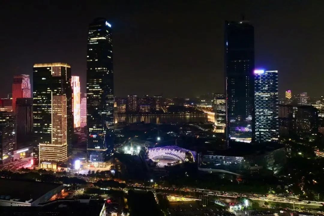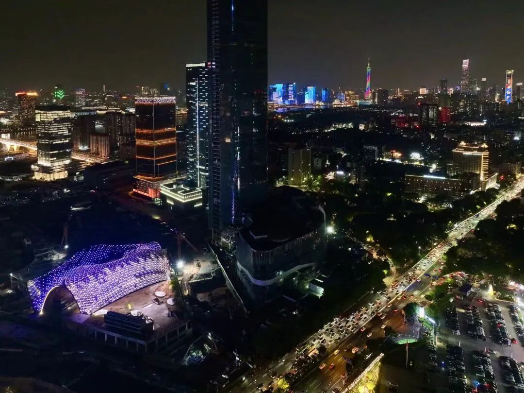 金融城广场位于广州国际金融城内核心地段,向南沿棠下涌连接珠江,是地区的北门户,在国庆假期期间亮灯,预计明年开业。