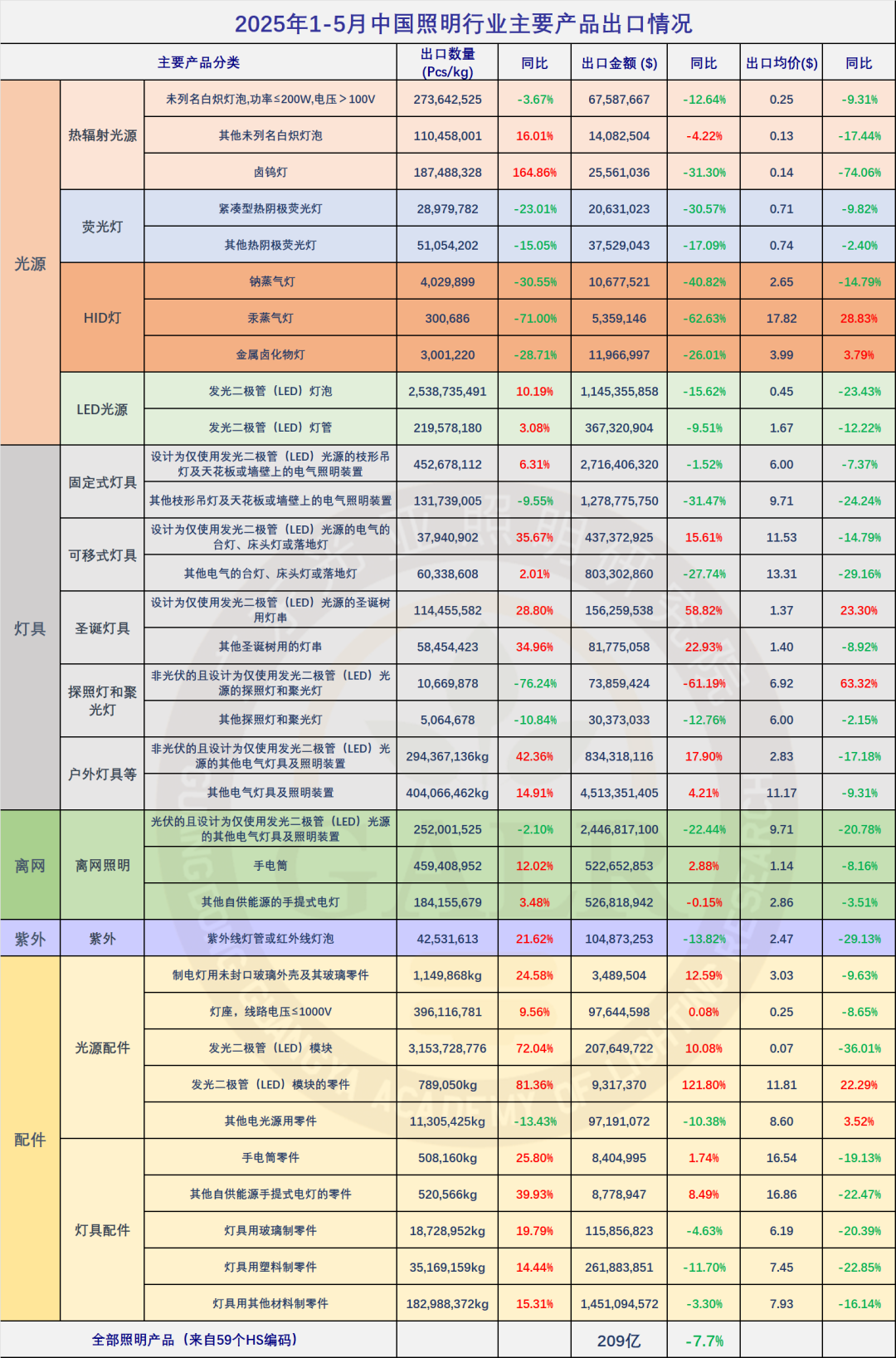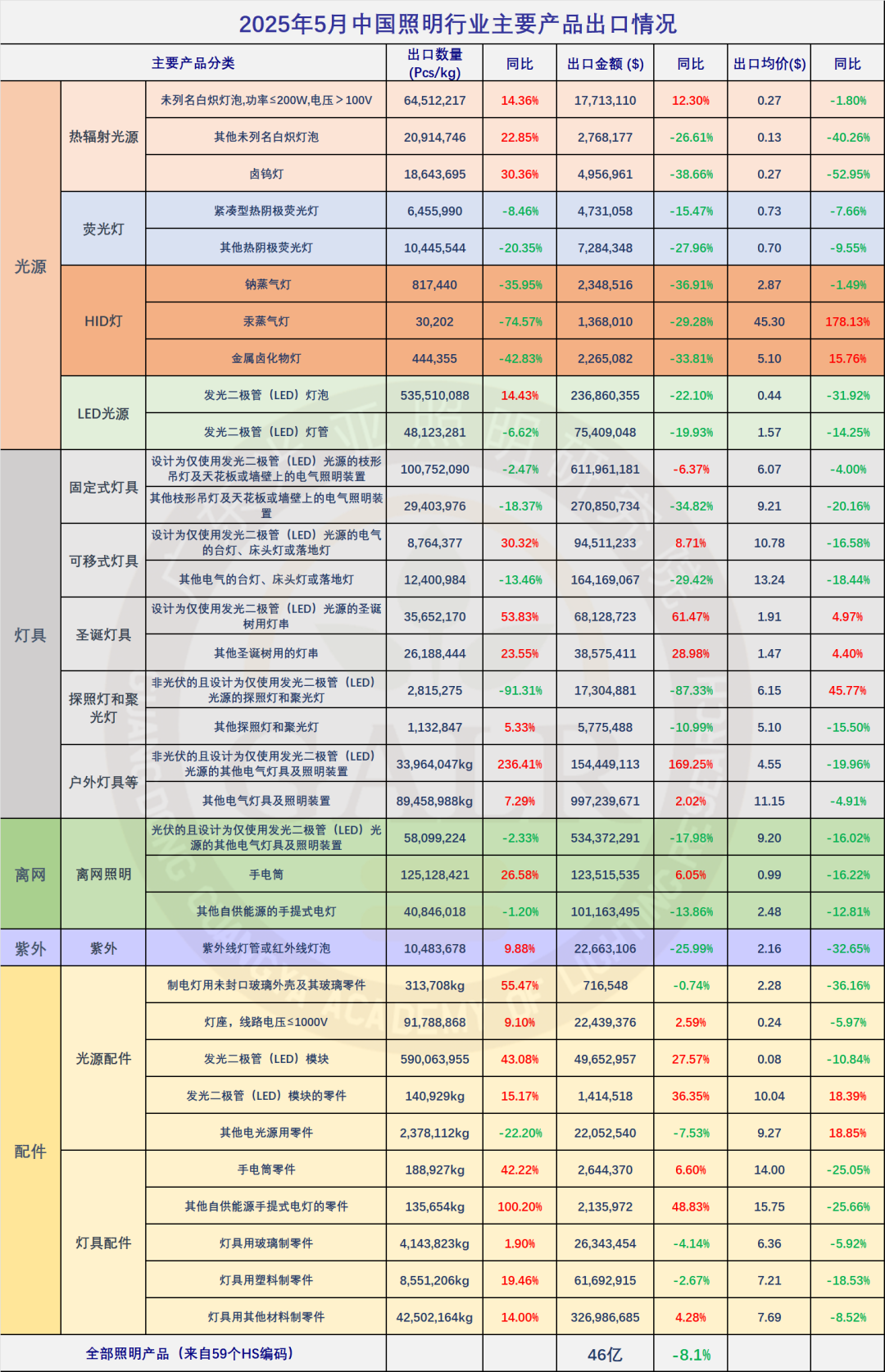 (点击查看大图) (点击查看大图) (点击查看大图) (点击查看大图) (点击查看大图) (点击查看大图) 展望后续,虽然近期中美间关税大幅下调,且第二轮会谈正在持续推进,但本轮中美关税博弈的核心问题仍未改变:一是特朗普政府秉承“美国优先”理念,推动全球产业链重构,压迫制造业回流,重塑全球经济秩序的目标始终未变;二是美国在诸多领域压制中国,中国基于维护本国发展权利而强力反制的这一难以调和的对峙持续存在;三是全球性高关税演变为长期化趋势。因此,外贸环境不确定性仍然较强,贸易碎片化风险仍然存在,都将对我国出口产生较大冲击。而除去关税因素外,价格因素也将对出口增速形成拖累。 5月12日,中美日内瓦联合声明给此前相当于熔断的中美贸易带来转机,虽然对于照明行业来说现有关税依然畸高,但部分细分领域的企业仍将有机会在90天过渡期“抢出货”,有利于接下来特别是6月出口数据回调。此后应密切关注中美之间和其他经济体与美国之间的经贸谈判进度(即关注关税率差),以及对等关税豁免商品范围。若90天过渡期内中美经贸谈判还是未能达成重大颠覆性协议,鉴于中国目前仍承受其他经济体此前未加征的IEEPA关税和301关税(中国照明产品对美出口关税税率最新情况),照明产品对美出口将继续受此叠加关税的拖累,出口前景仍然承压,正所谓“短期缓和难解长期挑战”。