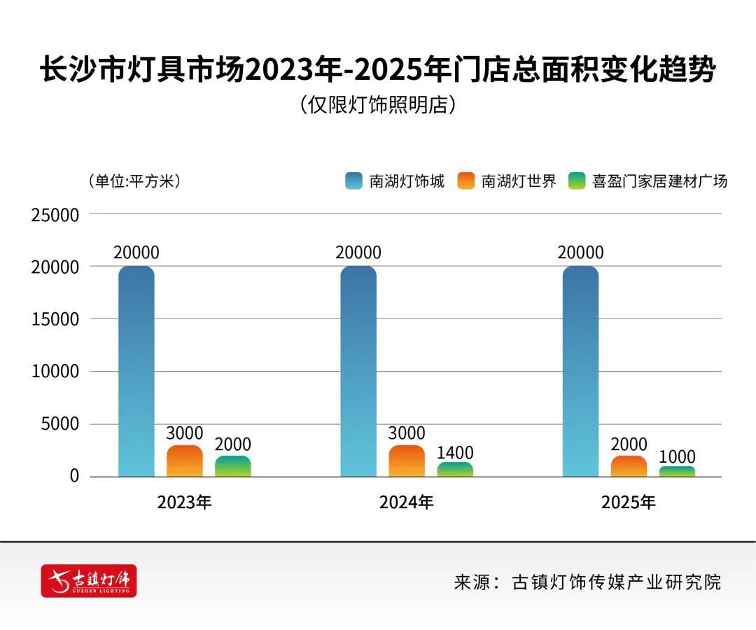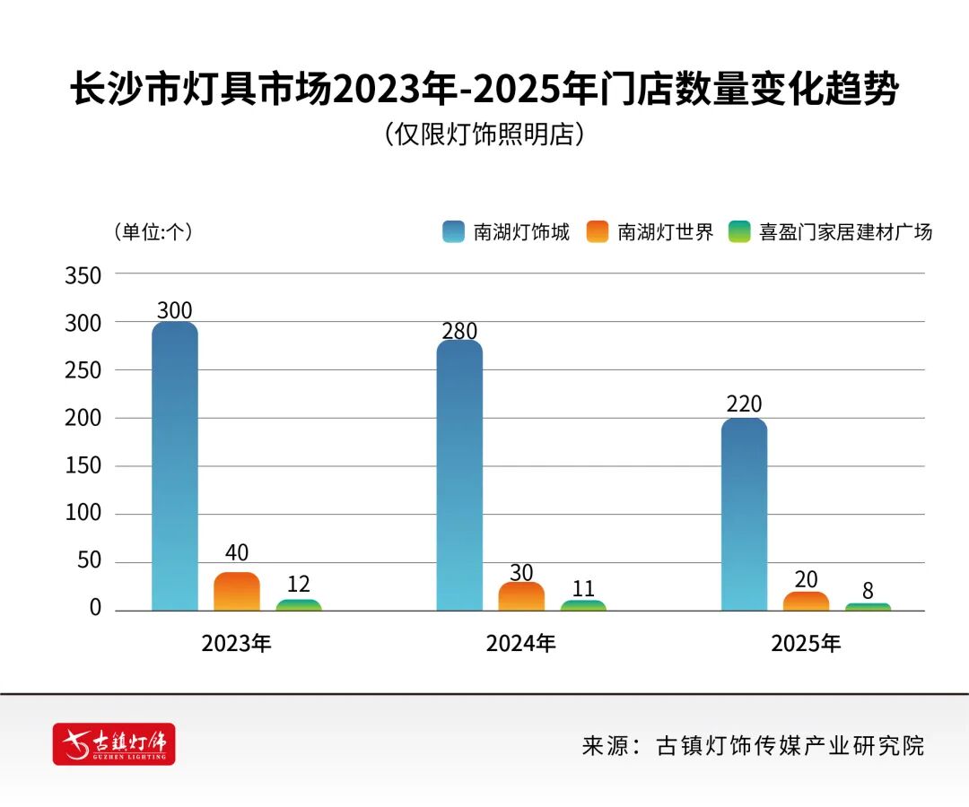 以长沙三大代表性市场为例:南湖灯饰城门店数量从2023年的300+家降至2025年的200+家,三年间减少约三分之一;南湖灯世界门店数量从40+家缩减至20+家,经营总面积从3000+平方米降至2000+平方米,反映出传统集散式灯具市场的萎缩;喜盈门家居建材广场的灯具门店从12家减少至8家,但单店面积有所扩大,显示出向精品化、专业化发展的趋势。