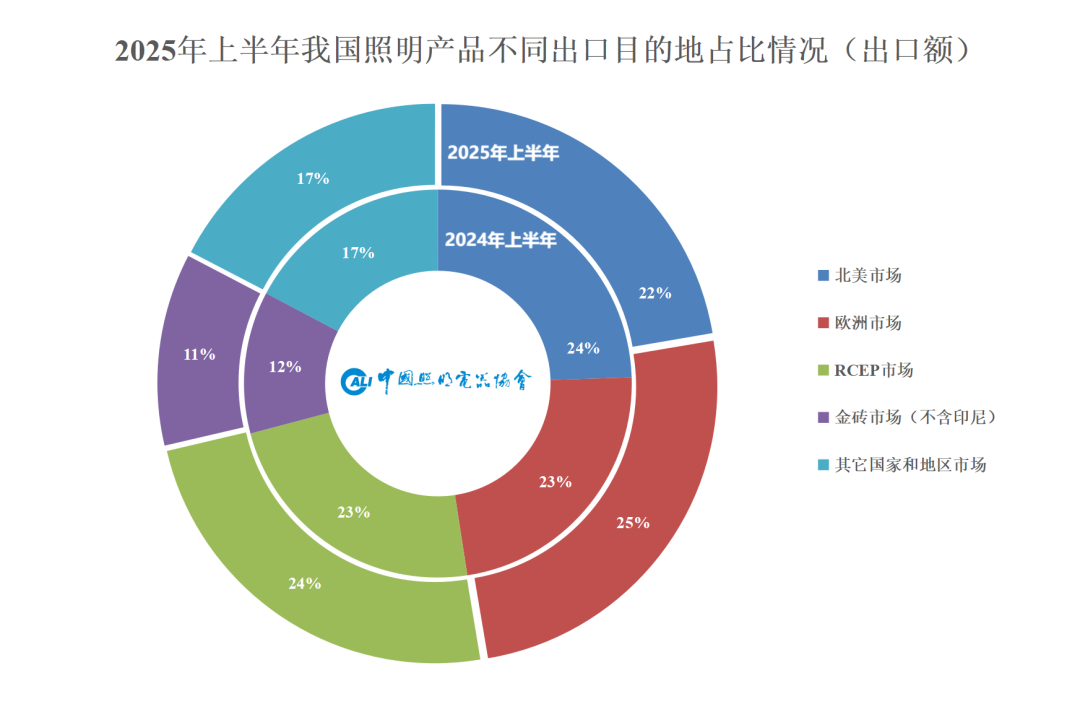 与之形成对比的是,欧盟、东盟、非洲对我国照明出口大盘维持正贡献。对欧盟出口额约49亿美元,同比增长4%;占出口总额19%,较去年同期上升2个百分点。其中,德国是欧盟第一大市场,前6月出口额约12亿美元,同比增长9%,约占欧盟市场23%,较2024年同期增长1个百分点。受益于欧盟对绿色照明、智能照明的政策导向,部分细分产品如LED智能控制系统、太阳能庭院灯等仍有稳中有升的表现,呈现出新的机会。对东盟出口额约46亿美元,同比增长约2%;占出口总额17%,较去年同期上升1个百分点。对非洲出口额约17亿美元,同比增长约4%;占出口总额7%,较去年同期上升1个百分点。新兴市场也正逐步从边缘消费者转向关键买家,为中国照明出口在欧美市场趋稳背景下提供了现实增长支点。