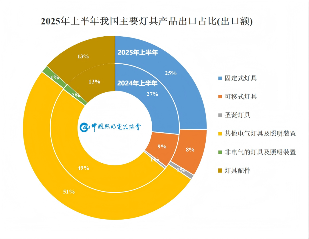2025年上半年,我国灯具类产品出口总额约194亿美元,同比下降6%,灯具类产品出口占总出口份额的75%,对整体出口形式的相对稳定,提供了一定拉动力。灯具出口中,不同品类间分化明显,部分细分领域依然保持增长,成为当前外贸不确定性下的稳定器。其中,LED装饰照明产品表现亮眼,如仅使用LED的台灯、床头灯、落地灯等家居照明品类出口额增长18%,出口量增长34%。该类产品的增长主要集中在对欧盟和中东市场的出口中。节日灯串类产品同样呈现出口额和出口量双增长的态势分别为29%和26%,受益于海外节庆采购周期恢复,在美国、墨西哥、荷兰等市场增长明显。光伏类户外照明产品继续放量增长,成为灯具产品中少有的“结构性增长点”。据海关数据显示,2025年上半年光伏照明类灯具出口量同比增长约25%,在多个非洲、拉美及东南亚国家市场需求持续走高。该类产品的增长反映出海外对低碳、离网照明方案的现实需求,也为我国照明企业拓展新能源结合型产品提供了示范。此外,中国照协在上半年对广东调研时了解到,部分企业已通过智慧照明等“高附加值”产品布局,逐步走出同质化红海;在渠道上,海外工程项目、跨境B2B订单恢复迹象明显,正在对冲欧美电商渠道回落的影响。